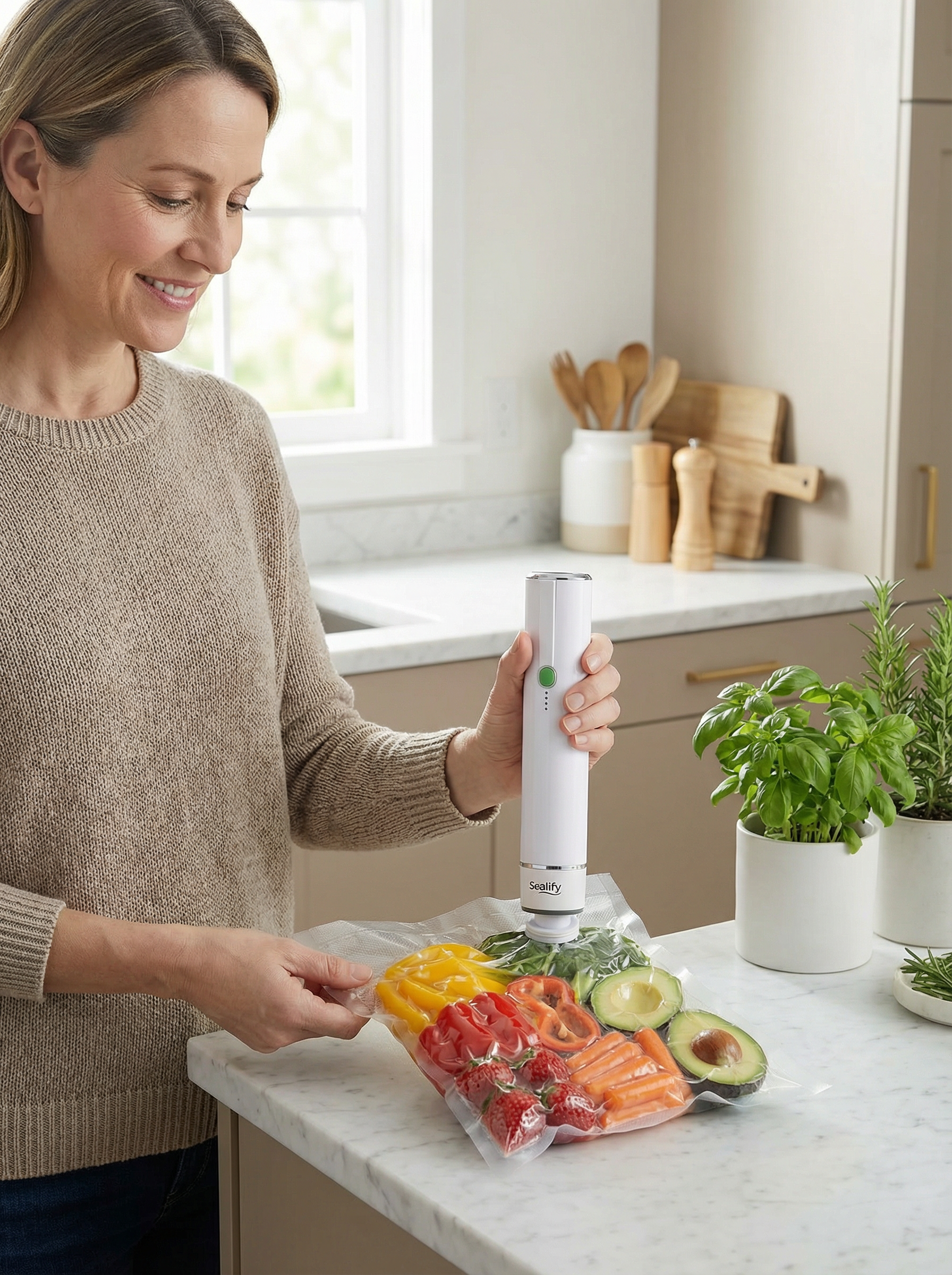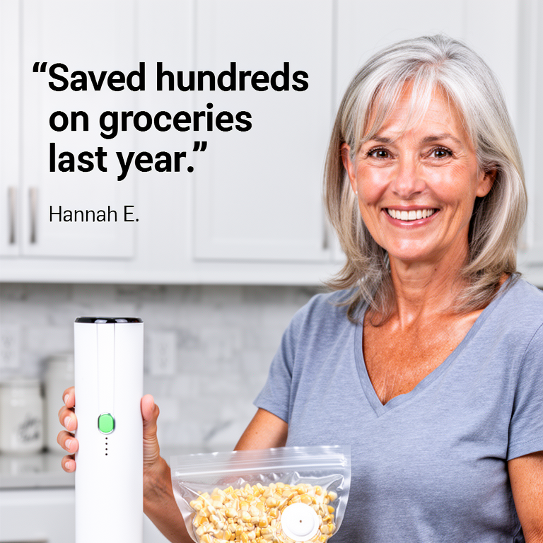 A palm-sized, cordless vacuum sealer that removes 98% of air in just 5 seconds. No cords. No complicated setup. No expensive plastic rolls. Just one button, and food that stays fresh up to 5x longer.